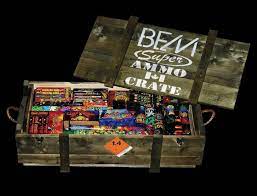 Huge assortment of popular fireworks products, in a sturdy wooden crate.